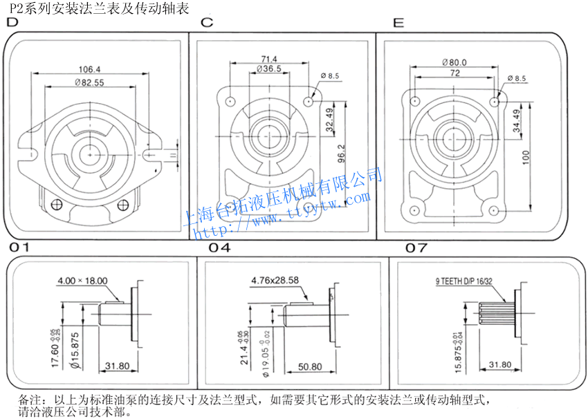 定量齒輪泵P2系列系列安裝法蘭表及轉動軸表