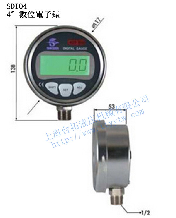 1、數(shù)位接點(diǎn)式壓力表SDI04,背光顯示,歸零設(shè)定,單位切換8種Si,Bar,kg/cm2,Kpa,Mpa,inHg,cmHg,Atm,感測(cè)器SUS316一體成型,防漏。