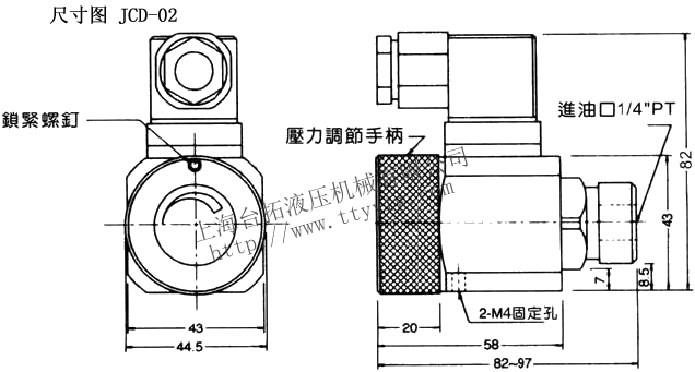 壓力繼電器JCD內(nèi)藏微動開關(guān),感應(yīng)來自液壓系統(tǒng)的壓力,傳達電氣信號給電磁換向閥或電氣馬達,使其改變切換方向或警告關(guān)閉油路,以達到系統(tǒng)安全的效果。