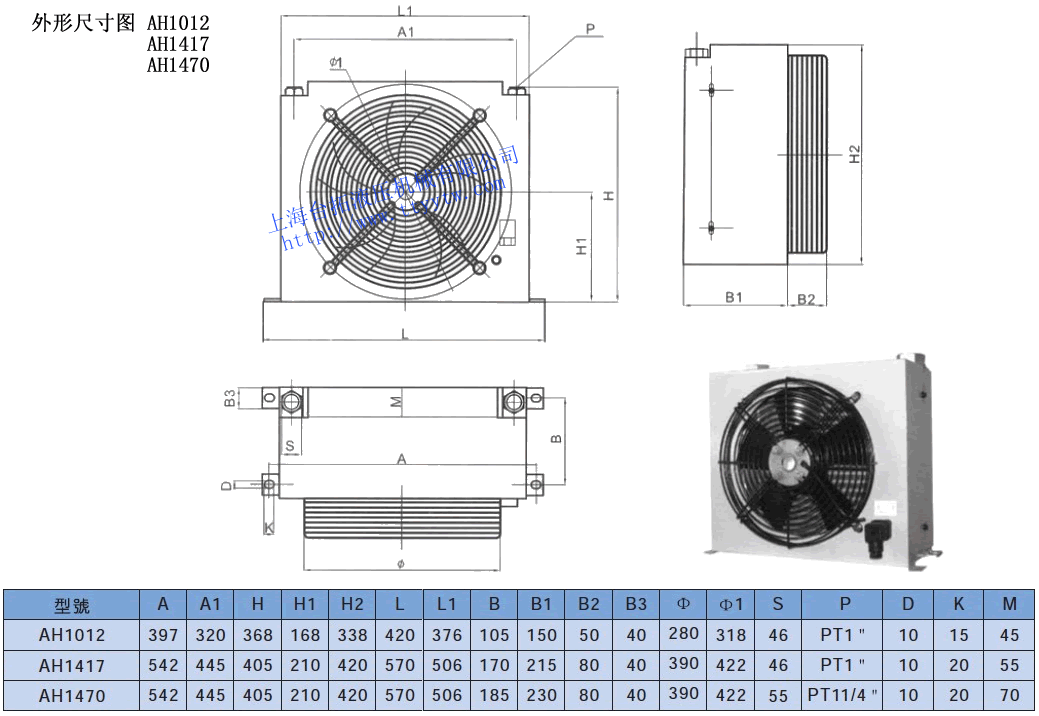 風冷機AH1系列:工作壓力2MPa,流量30?/min-300?/min,適用于變量泵的泄油冷卻。