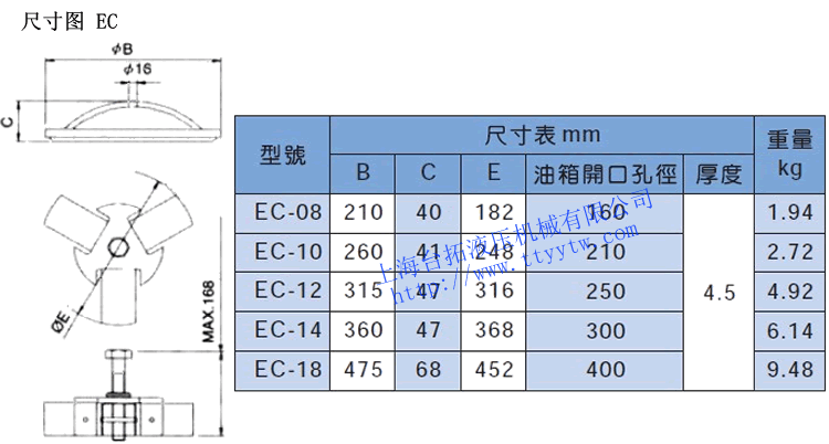 型號 重量 Kg EC-08 1.94 EC-10 2.72 EC-12 4.92 EC-14 6.14 EC-18 9.48 油箱側(cè)蓋EC尺寸圖