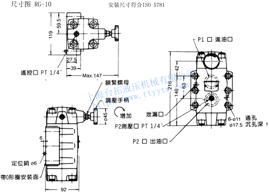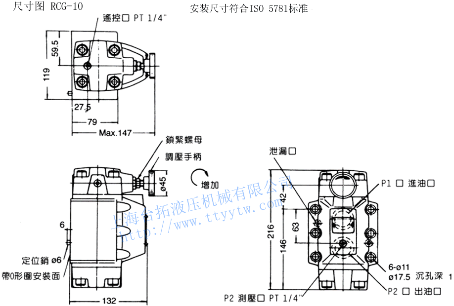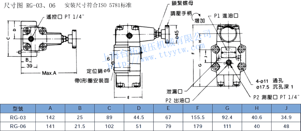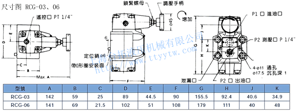 H:7-250.8 4.5 4.3 RCG-03 RCT-03 5.4 4.8 RG-06 RT-06 125 1 6.8 6.9 RCG-06 RCT-06 8.1 7.8 RG-10 RT-10 250 1.2 11.0 12.0 RCG-10 RCT-10 13.8 13.8 備注:1、減壓閥RG,RCG系列泄漏量為前后壓差20.5MPa時所測得的。2、減壓閥RCG、RCT裝有單向閥可使用于執行元件的A、B兩孔,而RG、RT只能應用于回路中的P孔。3、減壓閥RG,RCG系列調整調壓受柄時,升壓須順時針方向慢慢調整,降壓則相反方向,調壓后務必鎖定固定螺帽。4、減壓閥RG,RCG系列泄油口必須在一個接近于大氣壓力的低背壓下直接通油箱。