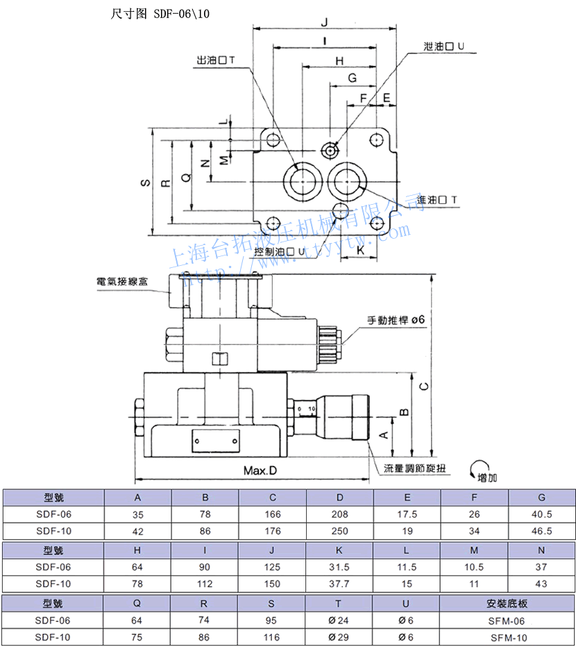 1、電磁控制調速閥SDF是由可調流量控制閥和電磁換向閥所組成單段式調速閥,平時液流截止,電磁閥動作時,流量大小可控制。適用于射出機液壓馬達回路、升降機等。