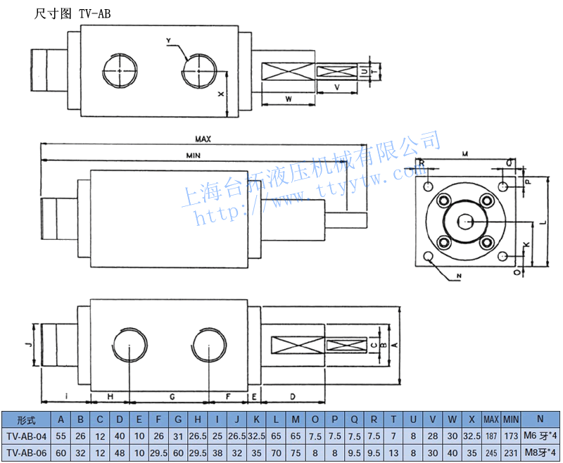 形式 A B C D E F G H I J K L M O P Q R T U V W X MAX MIN N TV-AB-04 55 26 12 40 10 26 31 26.5 25 26.5 32.5 65 65 7.5 7.5 7.5 7.5 7 8 28 30 32.5 187 173 M6牙*4 TV-AB-06 60 32 12 48 10 29.5 60 29.5 38 32 35 70 75 8 8 9.5 9.5 13 8 30 40 35 245 231 M8牙*4 雙位式流量控制閥TV-AB尺寸圖