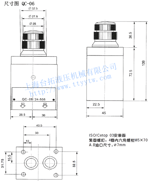 液壓符號 閥型號 QC-06/1 QC-06/6 QC-06/11 QC-06/16 QC-06/24 最大設定流量(?/min) 1.5 6 11 16 24 最小設定流量(?/min) 50 單頂閥B→A最大流量(?/min) 24 調節壓差△P(MPa) 0.3 0.3 0.5 0.65 0.8 A口最大流量(?/min) 24 最大壓力(MPa) 25 壓力補償型流量控制閥QC-06主要特性