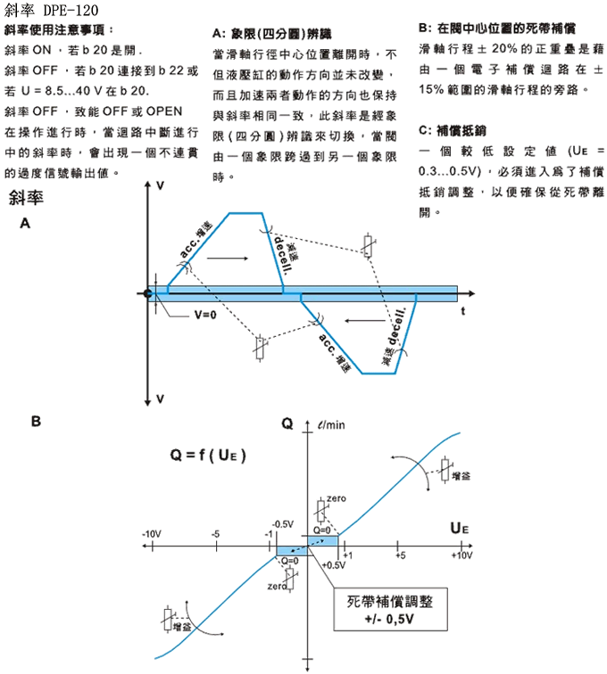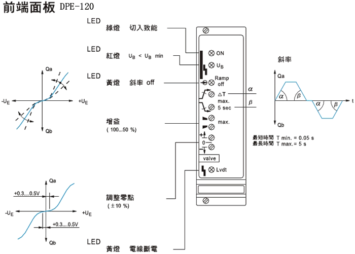 型號(hào) 所搭配的比例閥 線圈電流A 重量Kg 比例閥控制器型號(hào) DPG-03 3.7A 0.25 DPE-120 比例閥控制器DPE-120性能表