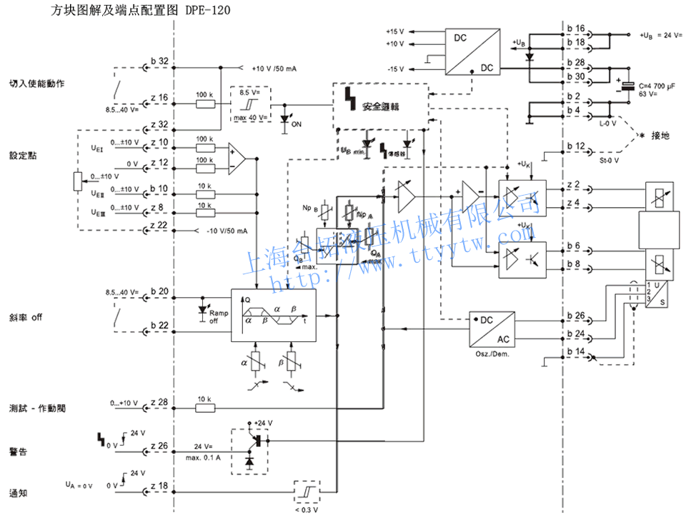 lmax=2.7Almax=3.7A 輸入訊號(hào)(設(shè)定點(diǎn)) 0~+10V總和選用對(duì)b 10,z 8,z 10,z 12, z 14/b 14;Ri=10KΩ 訊號(hào)源 電位計(jì) R≥1kΩ 供應(yīng)+10V b 32(50mA)