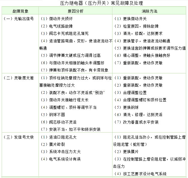壓力繼電器(壓力開關(guān))常見故障及處理
