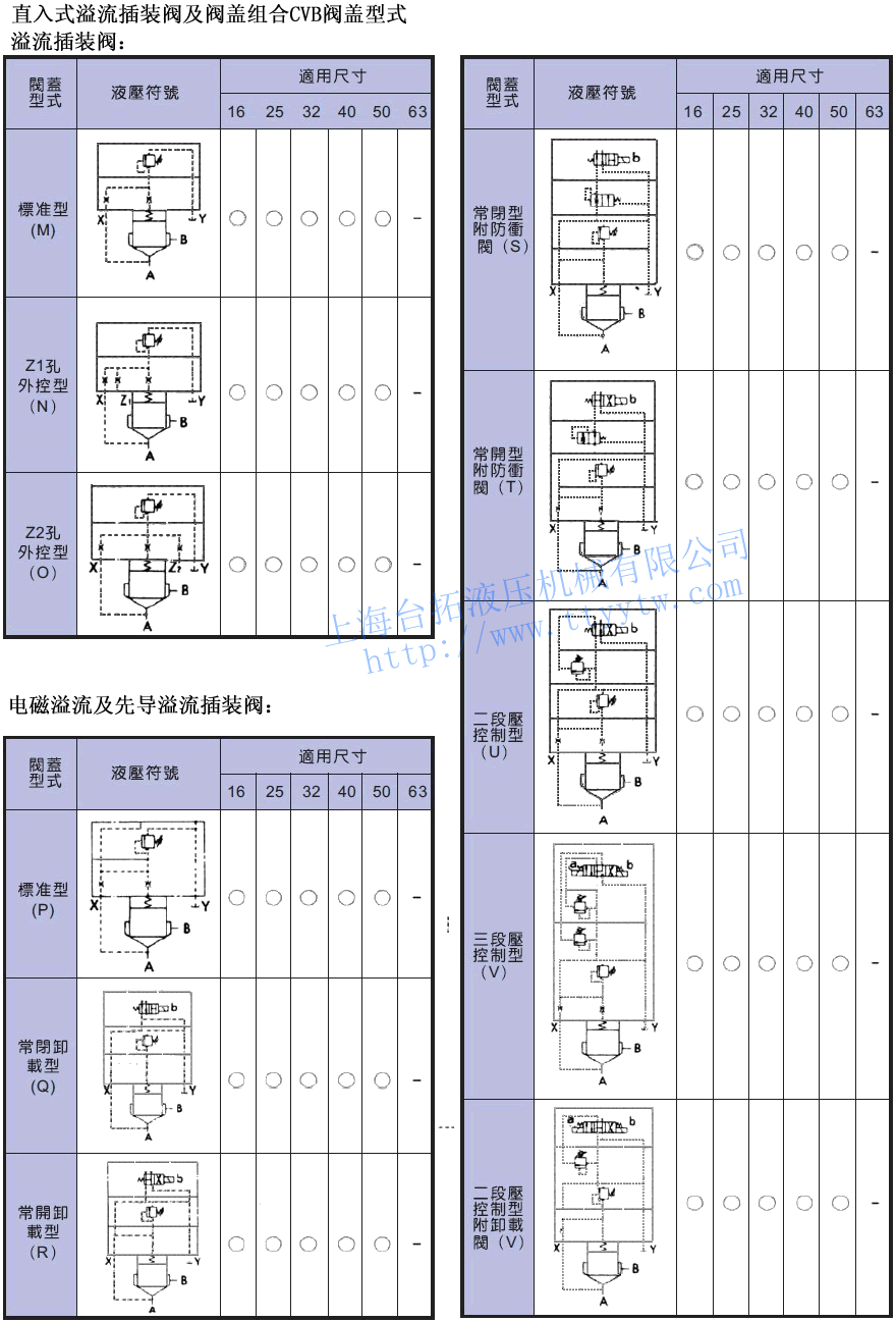 直入式溢流插裝閥及閥蓋組合CVB規格表