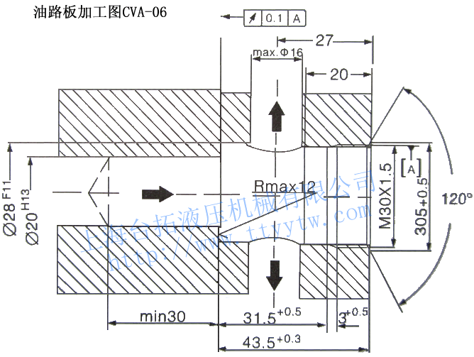 型號(hào) 最高使用壓力Mpa 最大流量?/min 重量Kg CVA-03 31 60 0.17 CVA-06 120 0.28 螺紋式插裝溢流閥CVA油路板加工圖