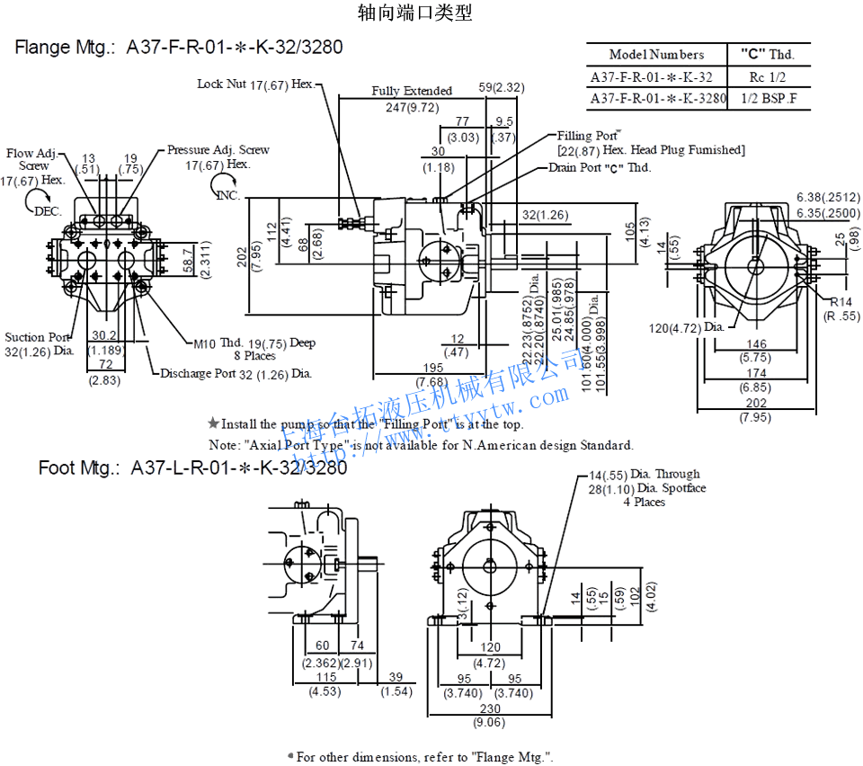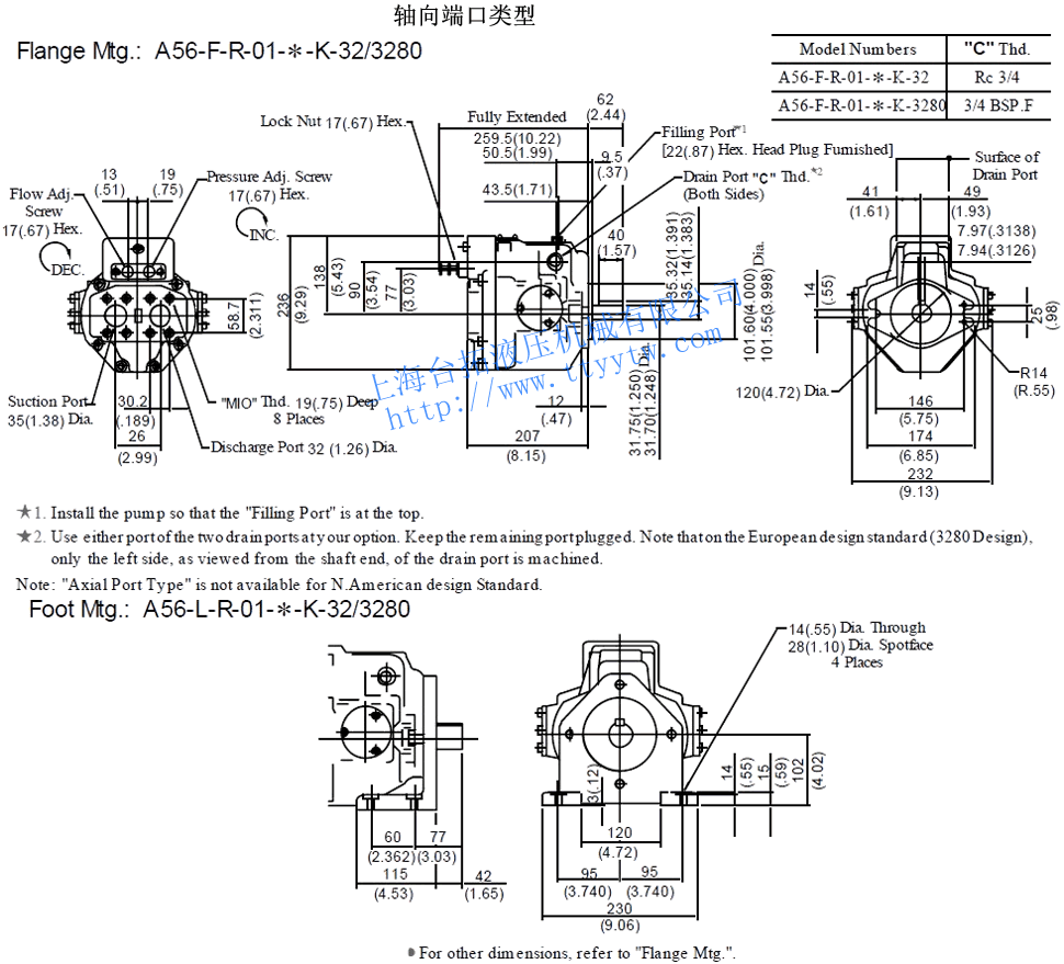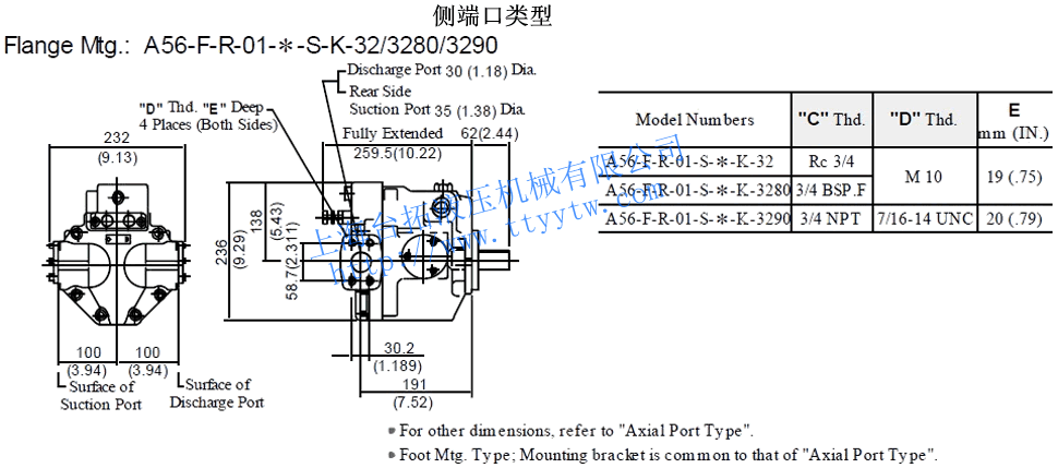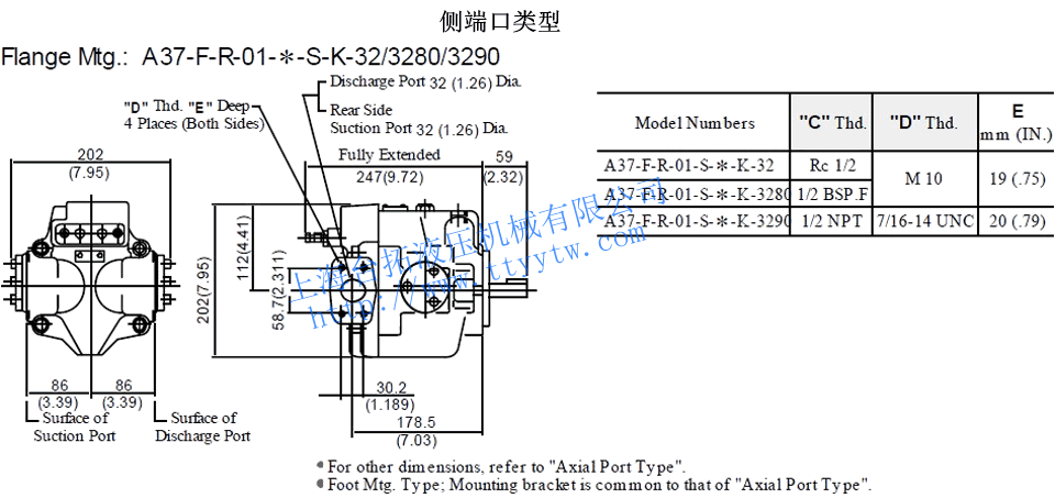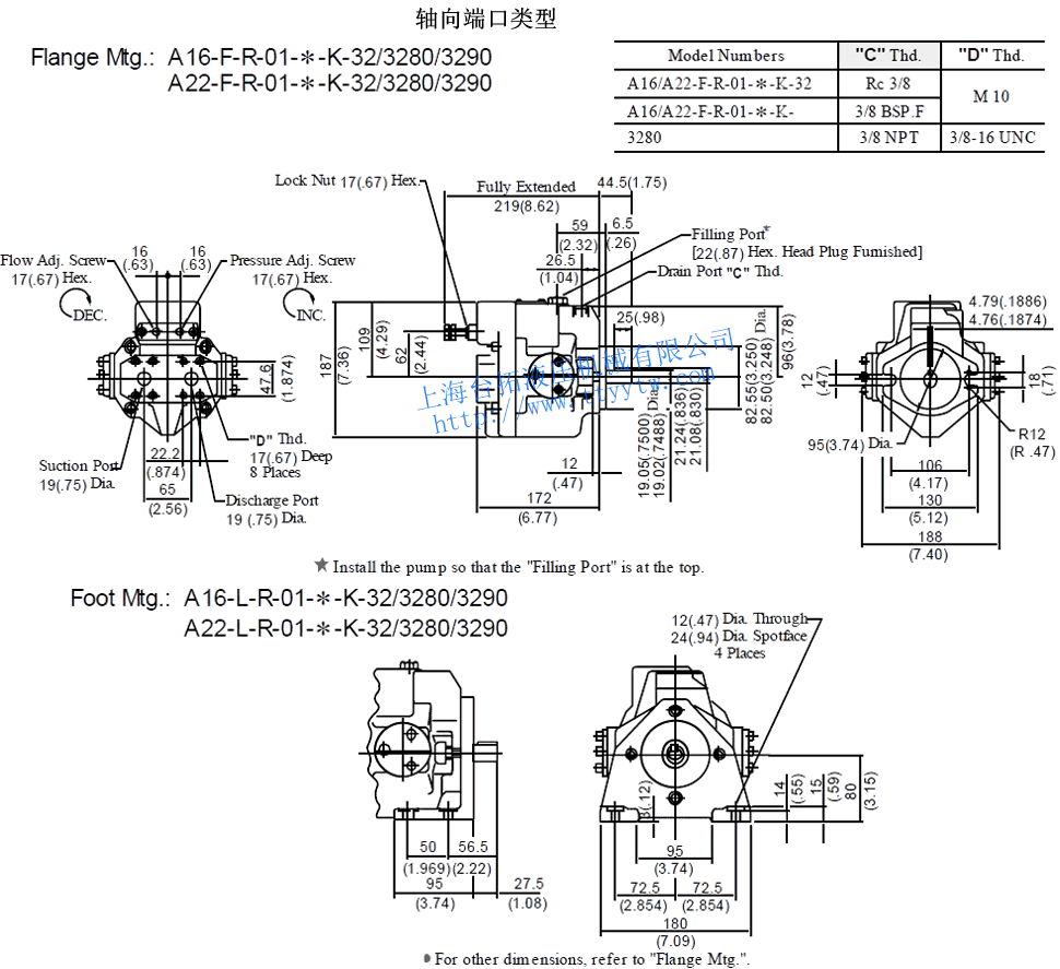 cm3/rev工作壓力Mpa 轉速范圍r/min 重量 Kg 額定 最高 ★2 最高 ★1 最低 法蘭安裝 底座安裝 A10-FR01B-12* 10.0 2 16 21 1800 600 5.1 - A10-FR01C/H-12* 8.5 A16-*-R-01-*-*-K-32 15.8 4 16 21 16.5 18.7 A22-*-R-01-*-*-K-32 22.2 6 16 16 16.5 18.7 A37-*-R-01-*-*-K-32 36.9 10 16 21 28.0 32.3 A56-*-R-01-*-*-K-32 56.2 12 16 21 35.0 39.3 A70-*R01*S-60* 70.0 30 25 28 58.5 70.5 A80-*-R-01-*-*-K-32 83.0 26 16 21 62.7 74.5 A90-*R01*S-60* 91.0 56 25 28 72.5 93 A125-*-R-01-*-*-K-32 125.0 60 16 17.5 80.6 97 A145-*R01*S-60* 145.0 83 25 28 92.5 117.5 A220-*-R-01-*-*-K-32 219.0 100 16 16 112 121 備注:(1)★1、設定壓力時,必須確保全截流壓力不超過允許的工作壓力。★2、泵在高于額定值情況下使用時,變量柱塞泵故障條件應受到限制。(2)可提供大排量變量柱塞泵,型號:A220-*-R-01-C-K-10,作壓力16Mpa,幾何排量219cm3/rev,轉速范圍600~1500r/min。
