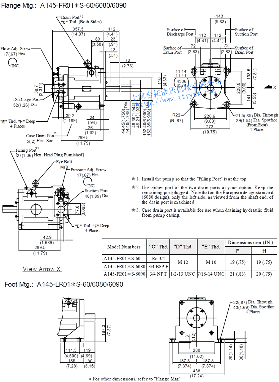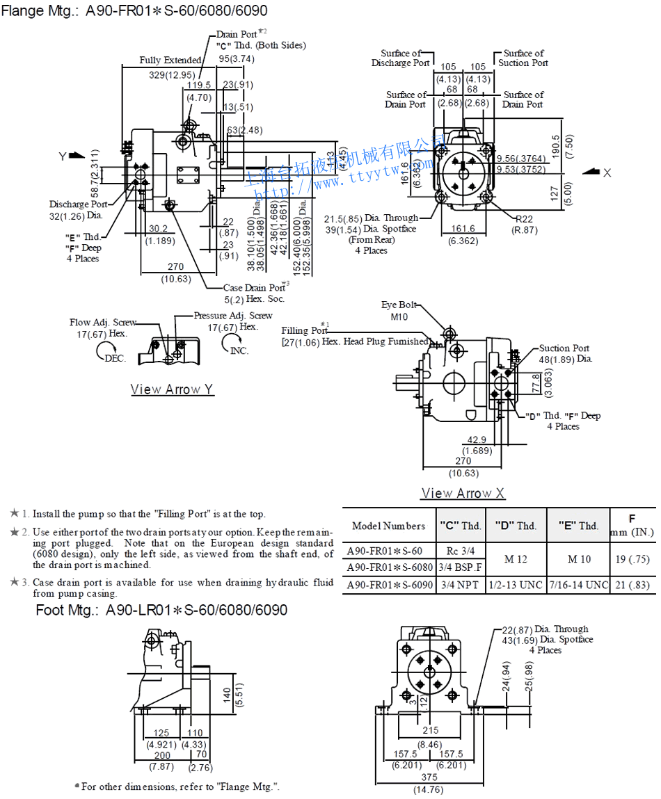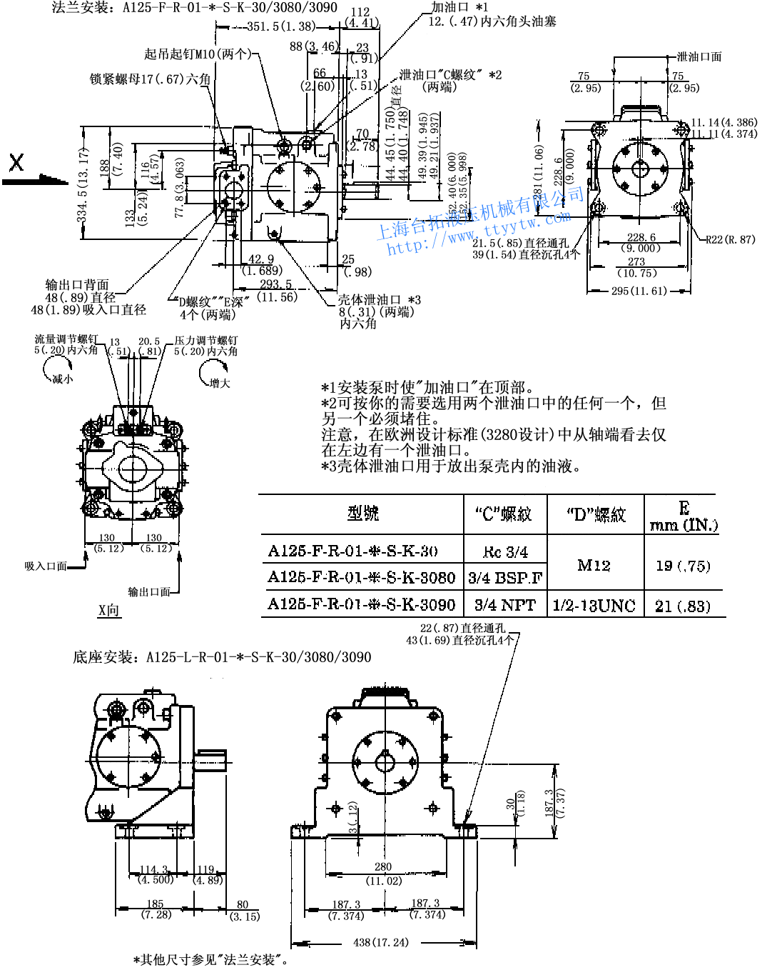 cm3/rev工作壓力Mpa 轉速范圍r/min 重量 Kg 額定 最高 ★2 最高 ★1 最低 法蘭安裝 底座安裝 A10-FR01B-12* 10.0 2 16 21 1800 600 5.1 - A10-FR01C/H-12* 8.5 A16-*-R-01-*-*-K-32 15.8 4 16 21 16.5 18.7 A22-*-R-01-*-*-K-32 22.2 6 16 16 16.5 18.7 A37-*-R-01-*-*-K-32 36.9 10 16 21 28.0 32.3 A56-*-R-01-*-*-K-32 56.2 12 16 21 35.0 39.3 A70-*R01*S-60* 70.0 30 25 28 58.5 70.5 A80-*-R-01-*-*-K-32 83.0 26 16 21 62.7 74.5 A90-*R01*S-60* 91.0 56 25 28 72.5 93 A125-*-R-01-*-*-K-32 125.0 60 16 17.5 80.6 97 A145-*R01*S-60* 145.0 83 25 28 92.5 117.5 A220-*-R-01-*-*-K-32 219.0 100 16 16 112 121 備注:(1)★1、設定壓力時,必須確保全截流壓力不超過允許的工作壓力。★2、泵在高于額定值情況下使用時,變量柱塞泵故障條件應受到限制。(2)可提供大排量變量柱塞泵,型號:A220-*-R-01-C-K-10,作壓力16Mpa,幾何排量219cm3/rev,轉速范圍600~1500r/min。